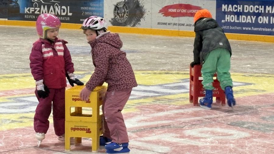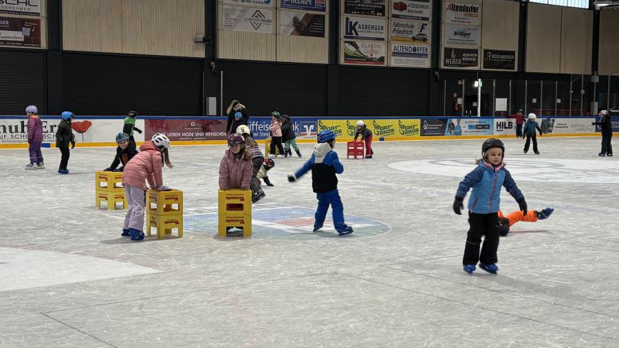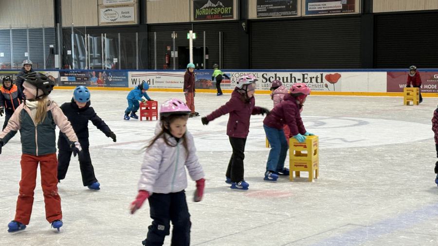 Die Kinder wagten ihre ersten Schritte auf dem Eis – mal vorsichtig an der Bande entlang, mal mutig mitten auf der Fläche. Besonders schön war zu sehen, wie sicherere Läuferinnen und Läufer den anderen halfen, die Balance zu finden oder kleine Runden zu drehen. Mit jedem Versuch wurden die Bewegungen sicherer, und bald sausten viele Kinder fröhlich über das Eis, begleitet von Lachen, kleinen Ausrutschern und viel Stolz über die eigenen Fortschritte.
