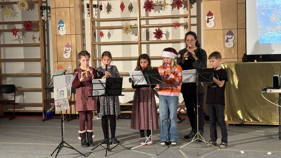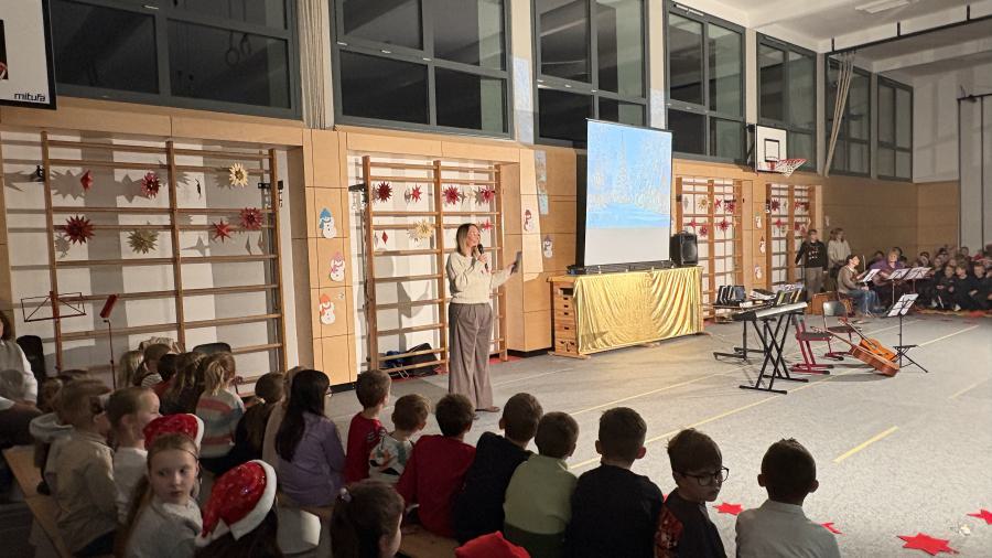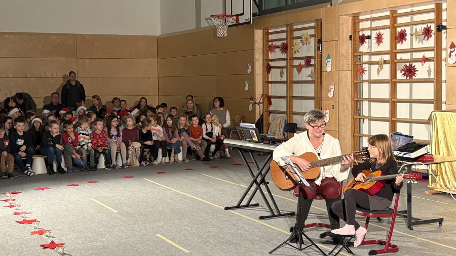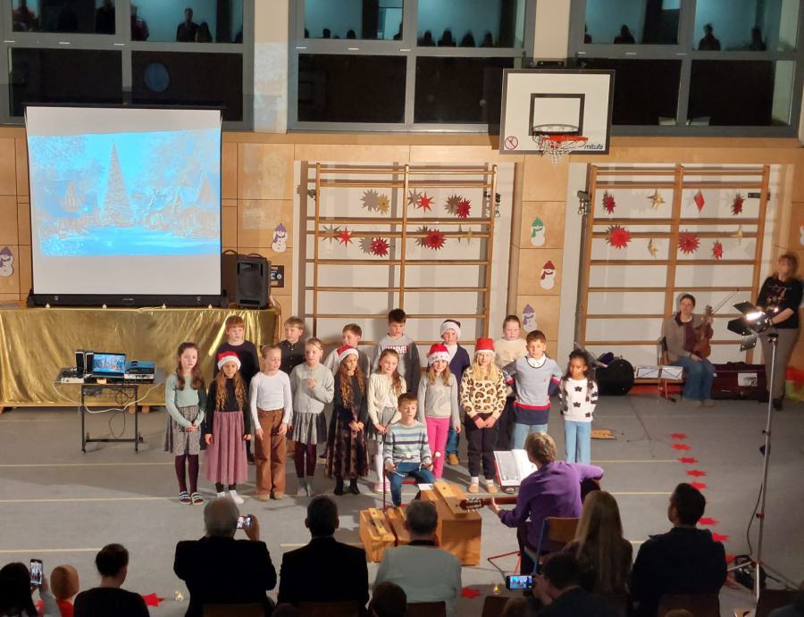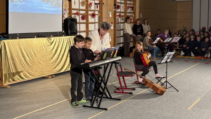 Eröffnet wurde die Feier mit dem gemeinsamen Lied „Das Licht einer Kerze“, das sofort für eine ruhige und feierliche Atmosphäre sorgte. Nach der Begrüßung durch die Schulleitung Frau Ott begeisterten Kinder unter der Leitung von Frau Heide das Publikum mit bekannten Weihnachtsliedern am Klavier und an der Gitarre, darunter „Morgen kommt der Weihnachtsmann“ und „Ihr Kinderlein kommet“.