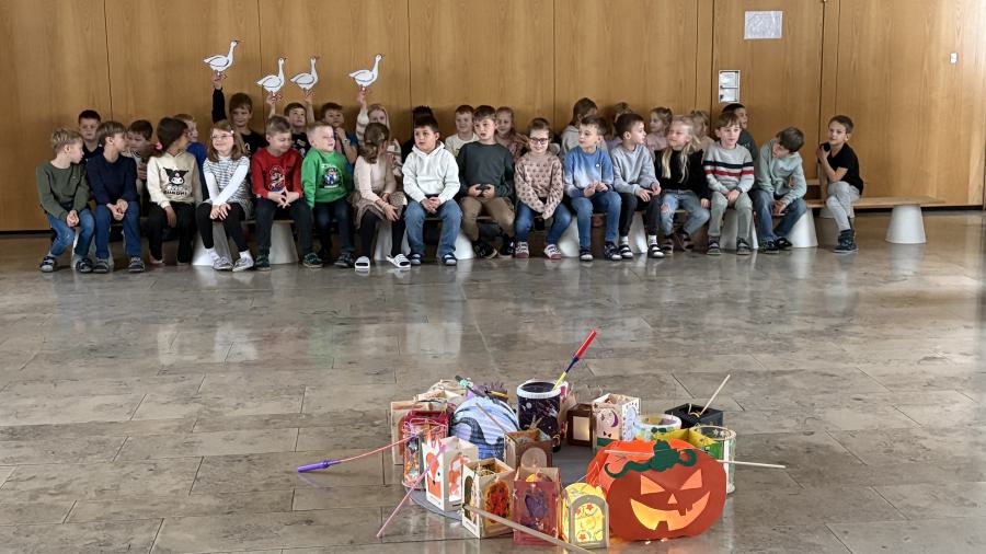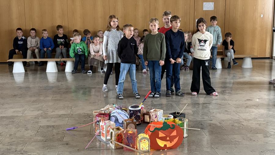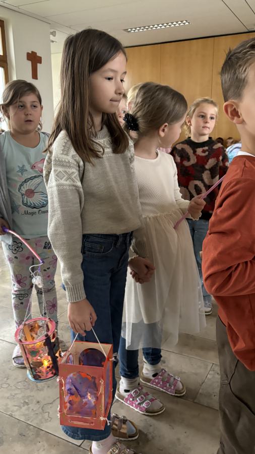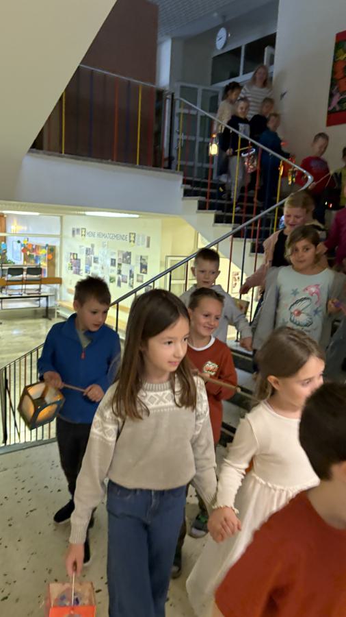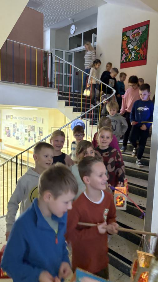 Am 11. November ziehen üblicherweise Kinder mit bunten Laternen durch die dunklen Straßen, um dem Heiligen Martin für seine Taten der Nächstenliebe zu danken. So machte sich auch unsere erste Klasse mit ihren Laternen auf den Weg durch das Schulhaus.