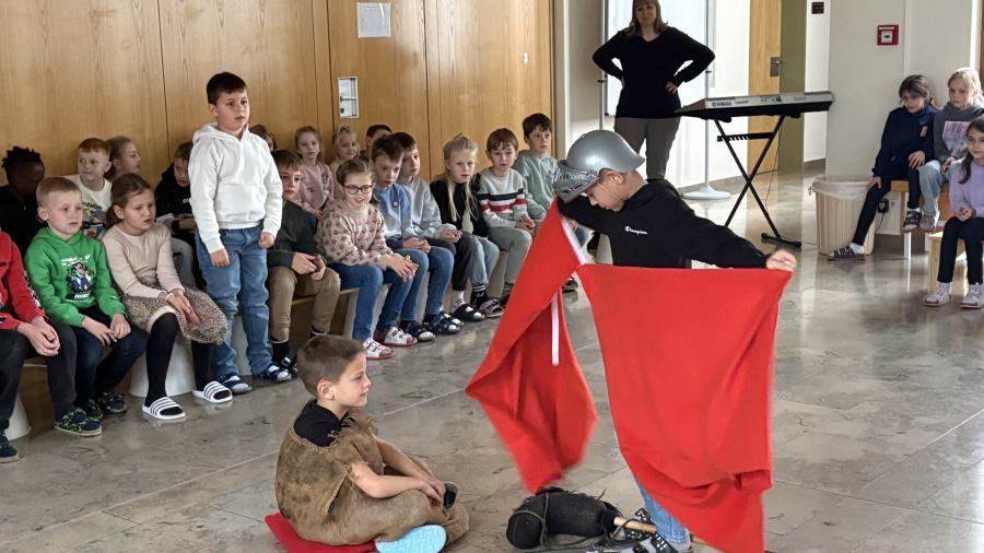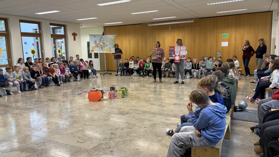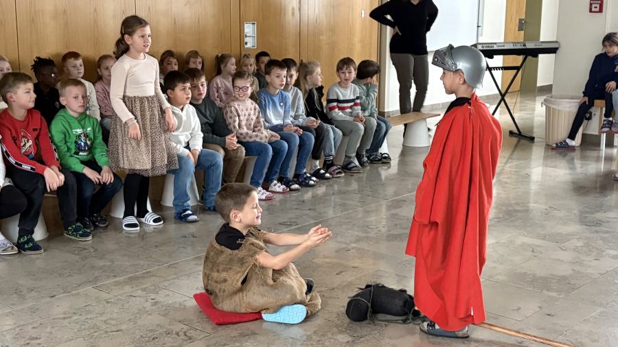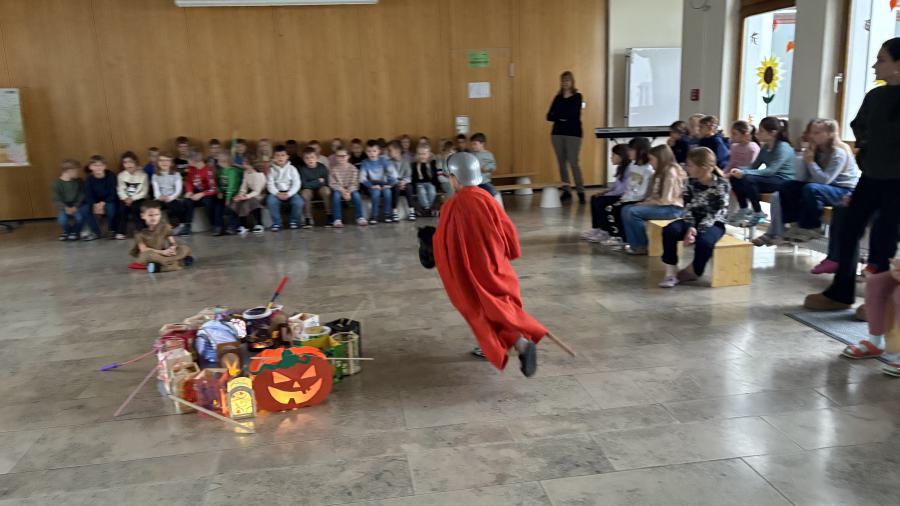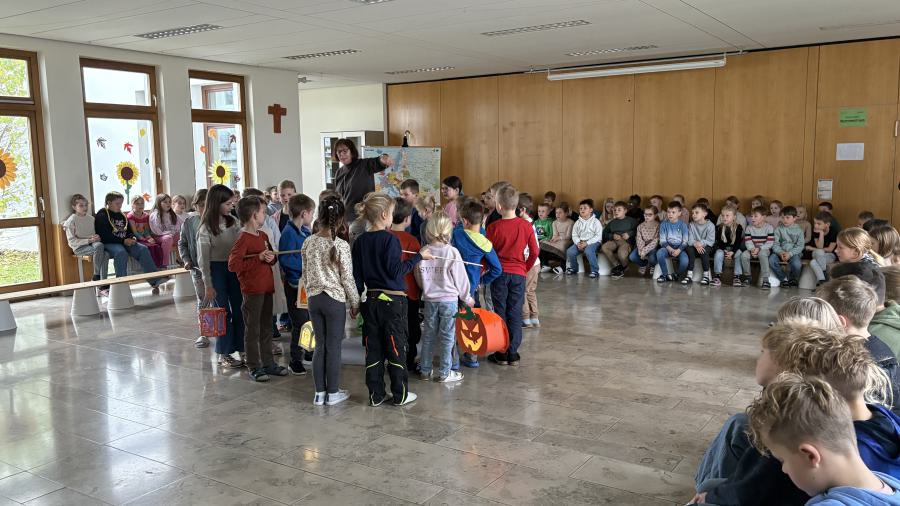 In einer kleinen Feier präsentierten anschließend die zweiten Klassen in der Aula das traditionelle Martinsspiel, um dem römischen Soldaten Martin von Tours, der auf seinem Pferd durch eine kalte Winternacht ritt und einem frierenden Bettler begegnete, zu gedenken. Martin zerteilte seinen Mantel mit dem Schwert und gab dem Mann die Hälfte, damit dieser nicht fror. Musikalisch umrahmt wurde diese besinnliche Stunde mit Liedern wie „Durch die Straßen auf und nieder“ sowie „Wie St. Martin will ich werden“. Hierbei kam zum Ausdruck, wie wichtig es ist, anderen Menschen zu helfen bzw. diese zu unterstützen. Frau Hösl von der Ortscaritas stellte auch dieses Jahr den Kindern die Wunschzettel-Aktion für das Haus der Freundschaft in Satu Mare vor, welche Hilfsprojekte in Rumänien fördert. Diese Aktion möchten wir auch in diesem Schuljahr unterstützen und den Gedanken des Teilens in alle Familien hinaustragen. Wir sagen schon vorab ein herzliches Dankeschön an alle Spender!