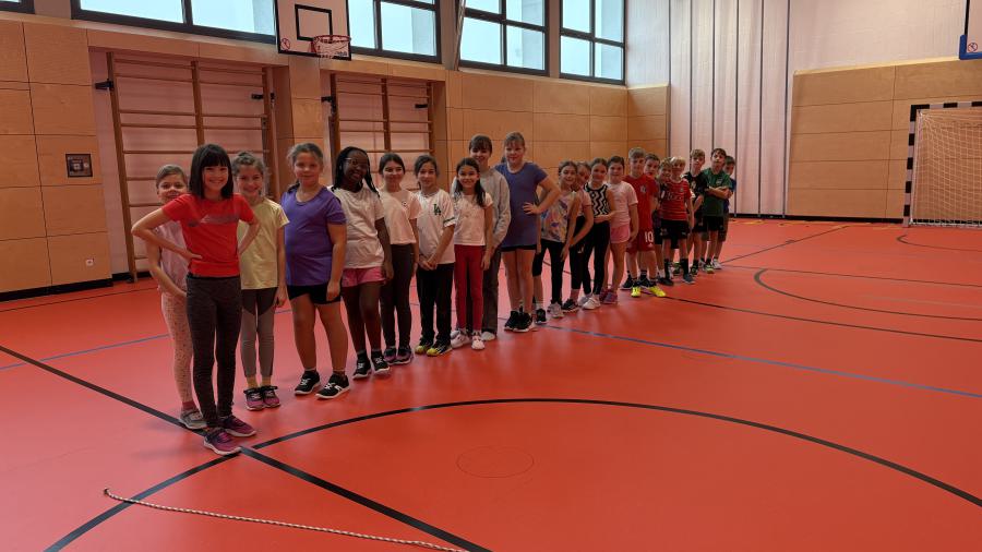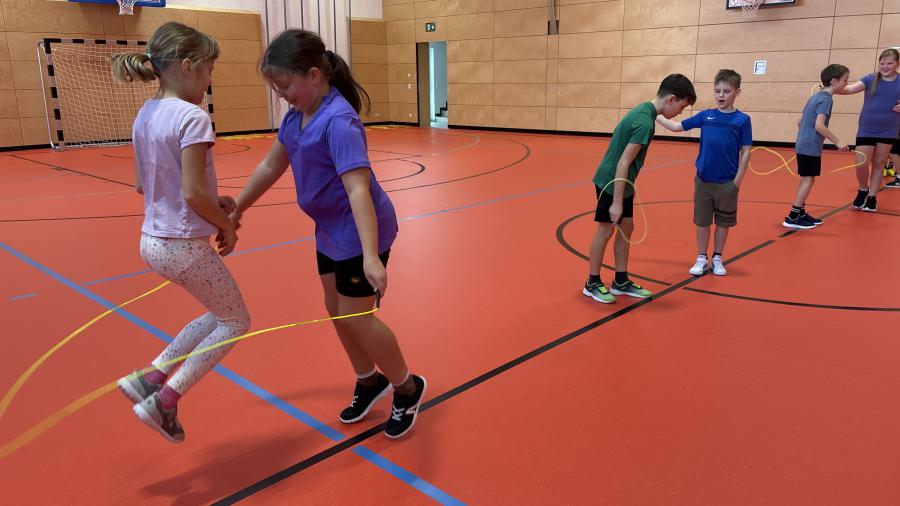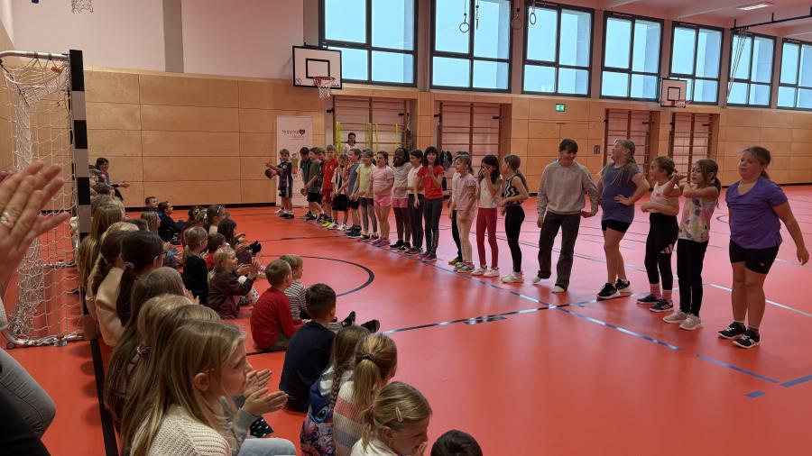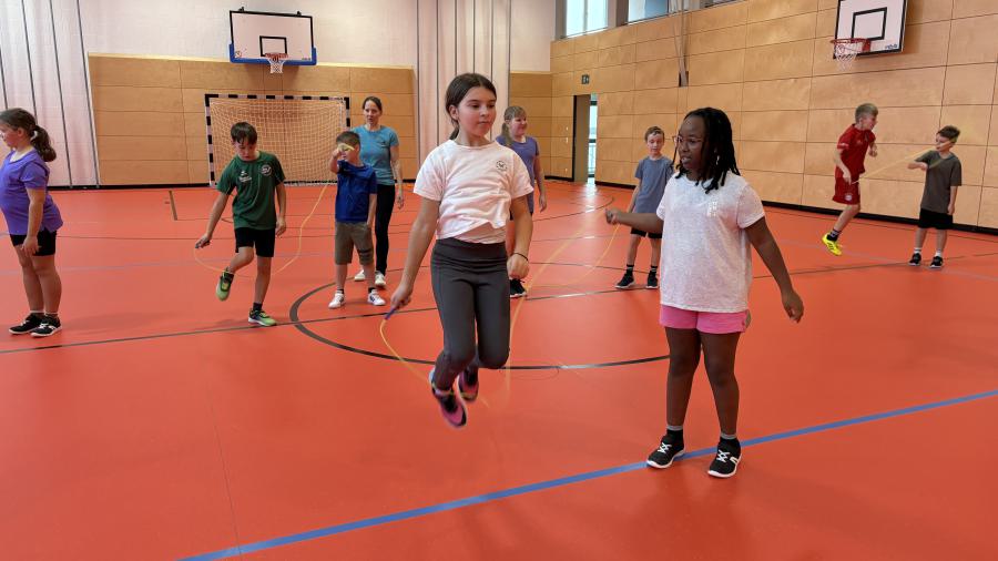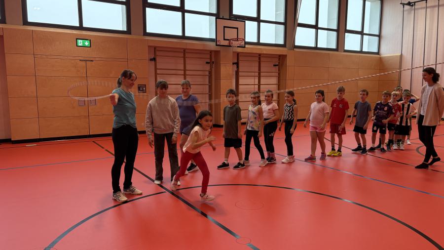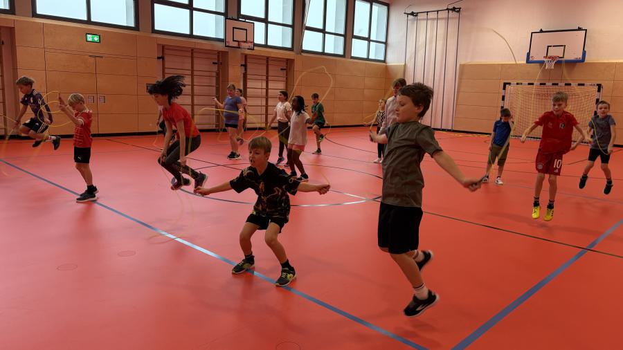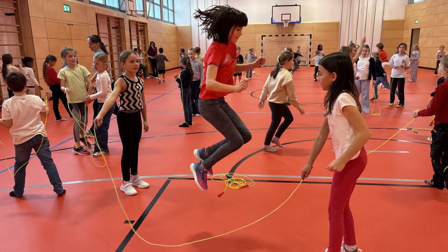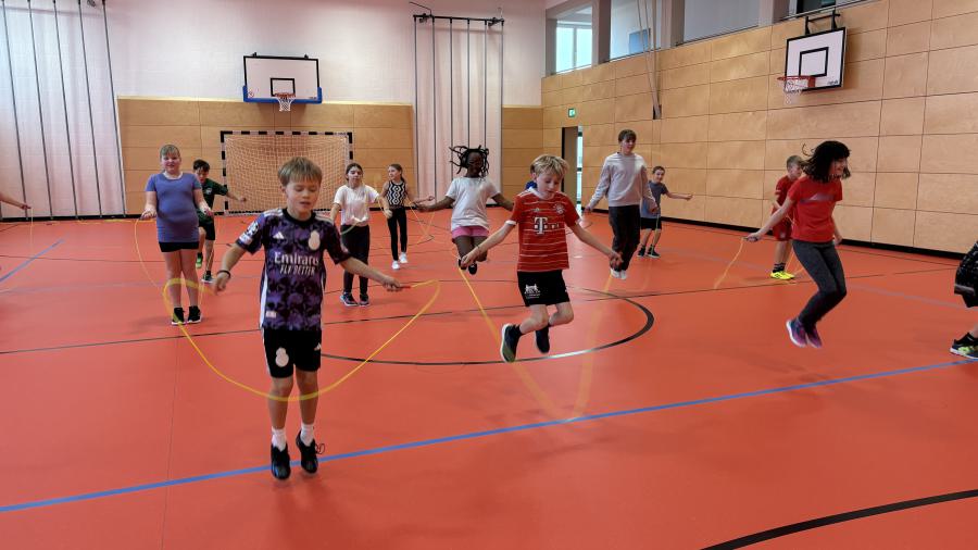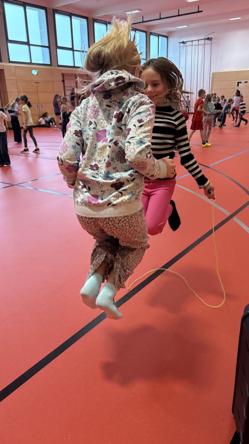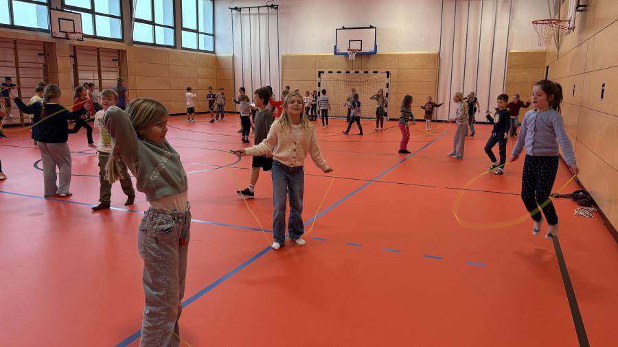 Den Abschluss bildete eine kleine Vorführung, bei der die Kinder ihr neu erlerntes Können präsentierten. Auch andere Klassen verfolgten die Darbietung mit Begeisterung und ließen sich vom Seilspringen anstecken.