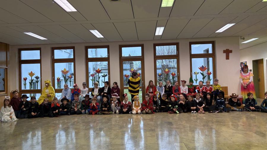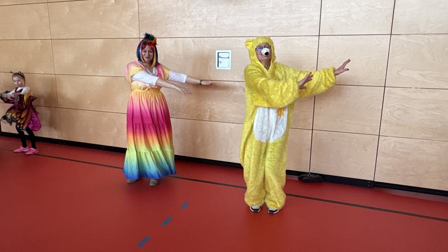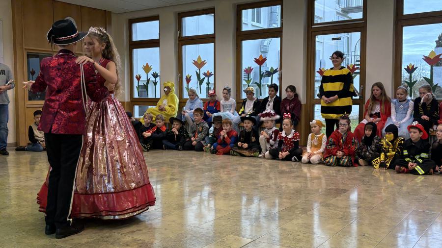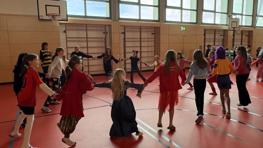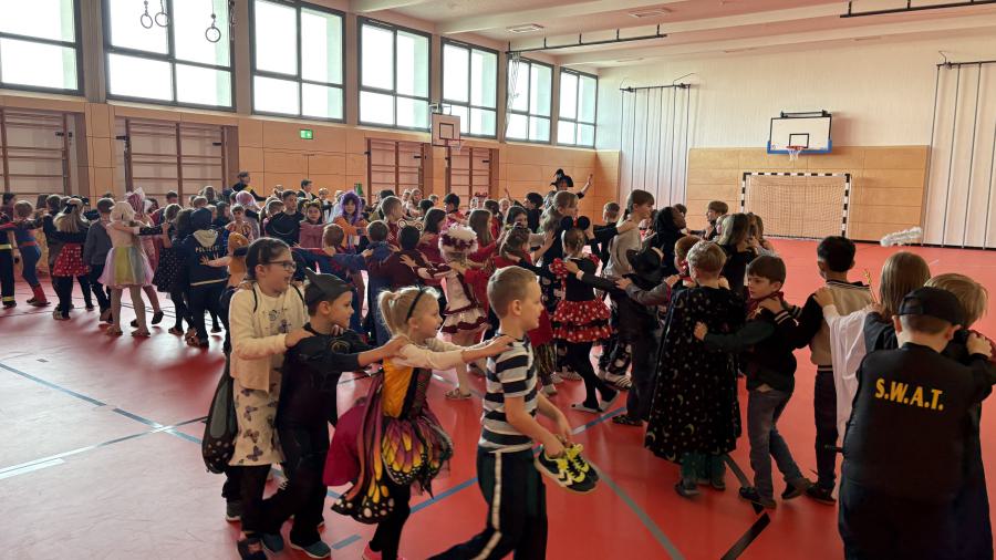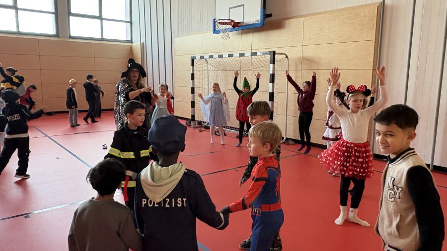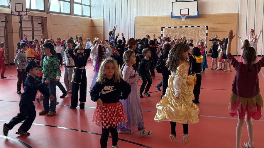 Später ging es in der Turnhalle noch närrisch weiter. Dort versammelten sich Schülerinnen, Schüler und Lehrkräfte zu einem gemeinsamen Faschingstreiben. Bei Musik und Tanz wurde gefeiert, geklatscht und gelacht.